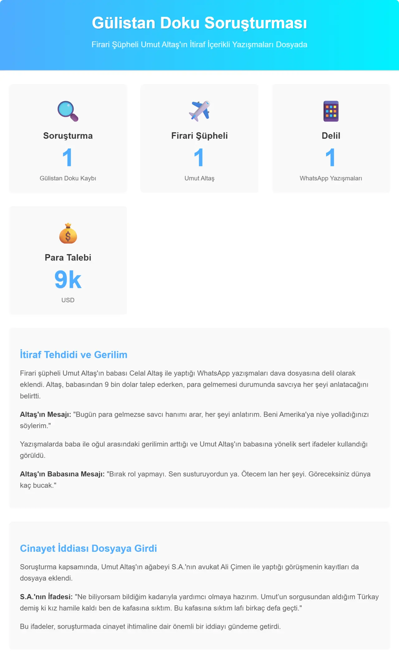 Gülistan Doku soruşturmasında firari Umut Altaş'ın babasıyla yaptığı ve "her şeyi anlatırım" dediği WhatsApp mesajları dava dosyasına delil olarak eklendi.