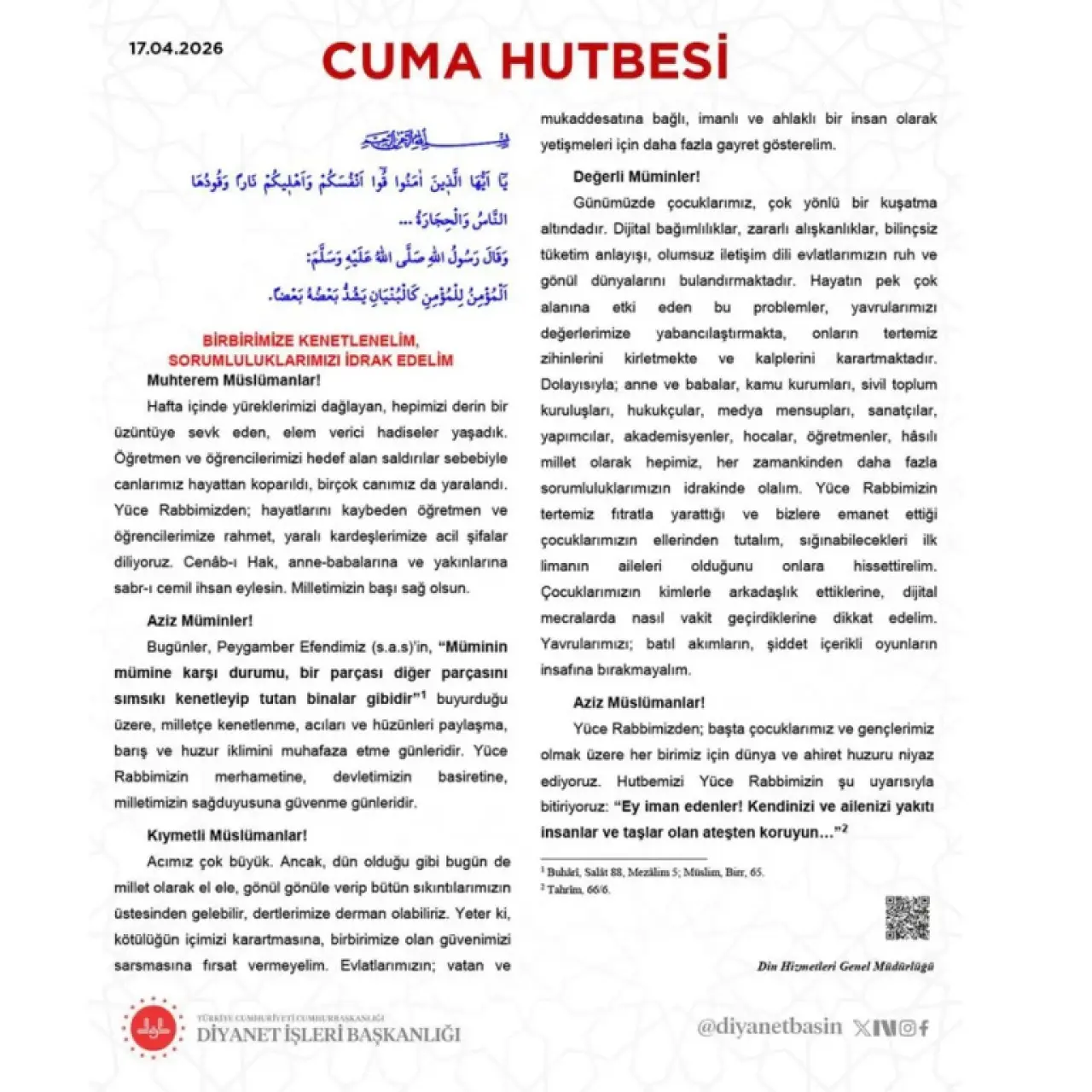 Saldırıların ardından oluşan güvensizlik iklimine karşı birlik çağrısı yapılacak olan hutbede, kötü niyetli girişimlerin toplumda korku oluşturmasına izin verilmemesi isteniyor. Gençlerin manevi değerlerden uzaklaşmasına yol açan bağımlılık türlerine karşı sadece ailelerin değil; kamu kurumları, sivil toplum kuruluşları ve eğitimcilerin de ortak bir kalkan oluşturması gerektiği belirtilecek.