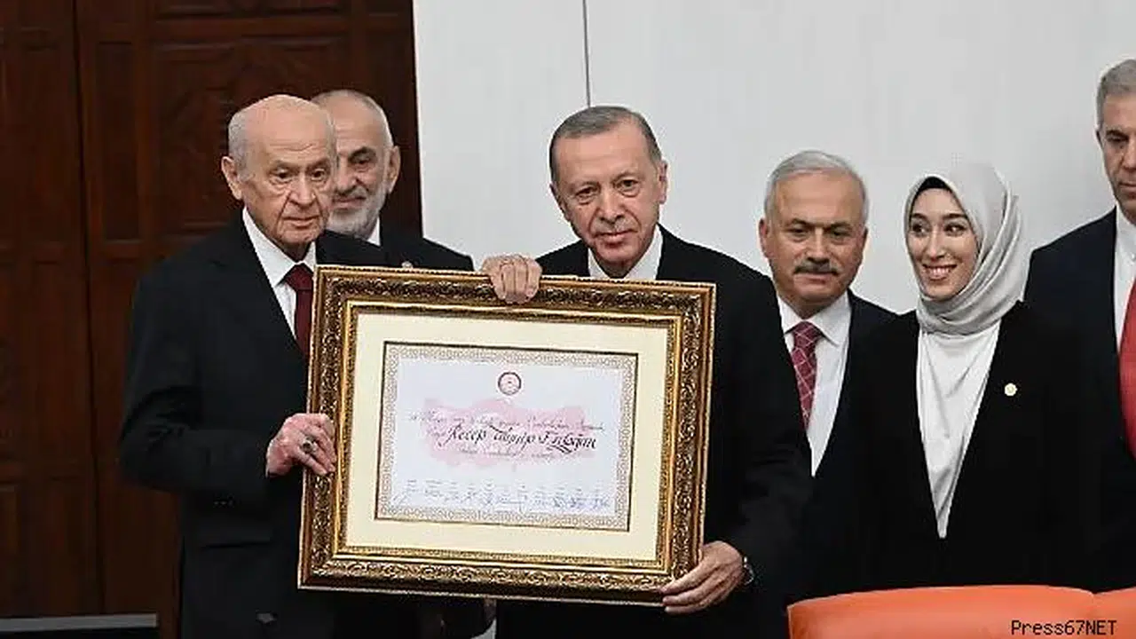 Cumhurbaşkanlığı Seçimi'ni kazanan AKP'li Cumhurbaşkanı Recep Tayyip Erdoğan, mazbatasını TBMM Geçici Başkanı Devlet Bahçeli'den almasının ardından Türkiye Büyük Millet Meclisi'nde (TBMM) yemin etti. Erdoğan, yemin etmesinin ardından resmen göreve başladı.