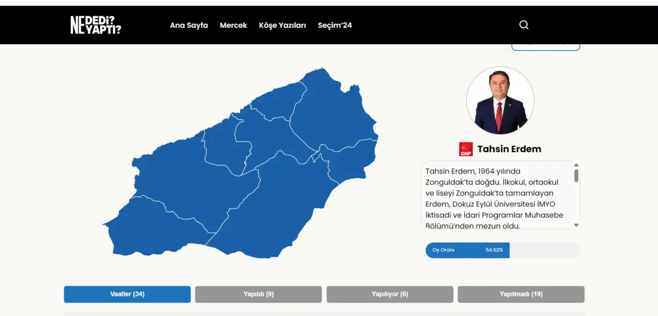 Zonguldak Belediye Başkanı Tahsin Erdem'in seçim döneminde kamuoyuna duyurduğu projelerdeki son durum netlik kazandı. Paylaşılan güncel verilere göre, toplam 34 vaatten 9'u tamamlanarak vatandaşın hizmetine sunuldu. 6 projenin yapım süreci devam ederken, kalan 19 vaat ise henüz "yapılmadı" statüsünde bekliyor.