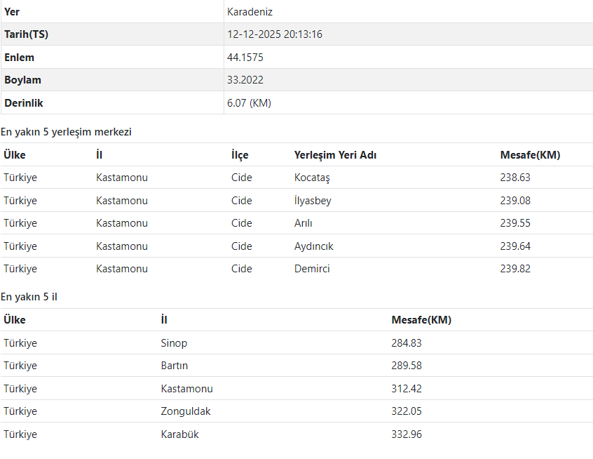 Depremin, en yakın yerleşim merkezine 238.63 kilometre uzaklıkta gerçekleştiği kaydedilirken, Zonguldak’a olan uzaklığının ise yaklaşık 322 kilometre olduğu bilgisi paylaşıldı.