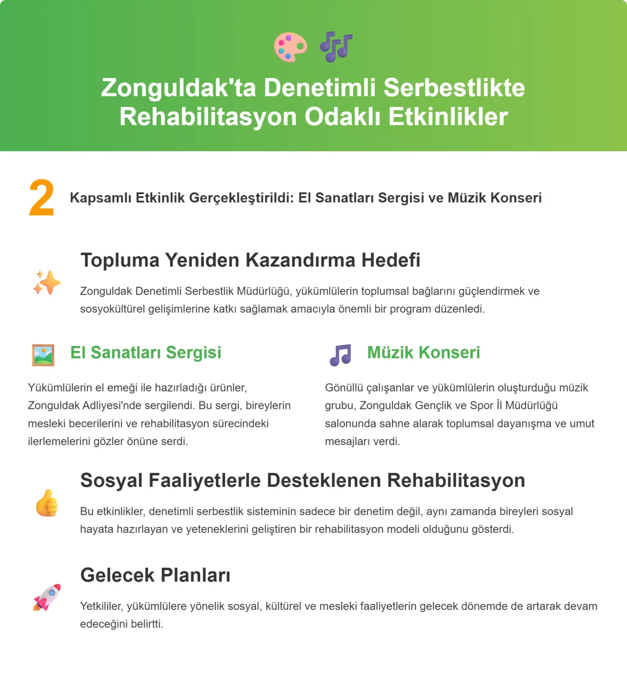 Günün devamında program, akşam saatlerinde düzenlenen bir konserle sürdürüldü. Denetimli Serbestlik Müdürlüğü bünyesindeki gönüllü çalışanlar ile yükümlülerin iş birliğiyle oluşturulan müzik grubu, 27 Nisan tarihinde saat 19.00’da Zonguldak Gençlik ve Spor İl Müdürlüğü salonunda sahne aldı.