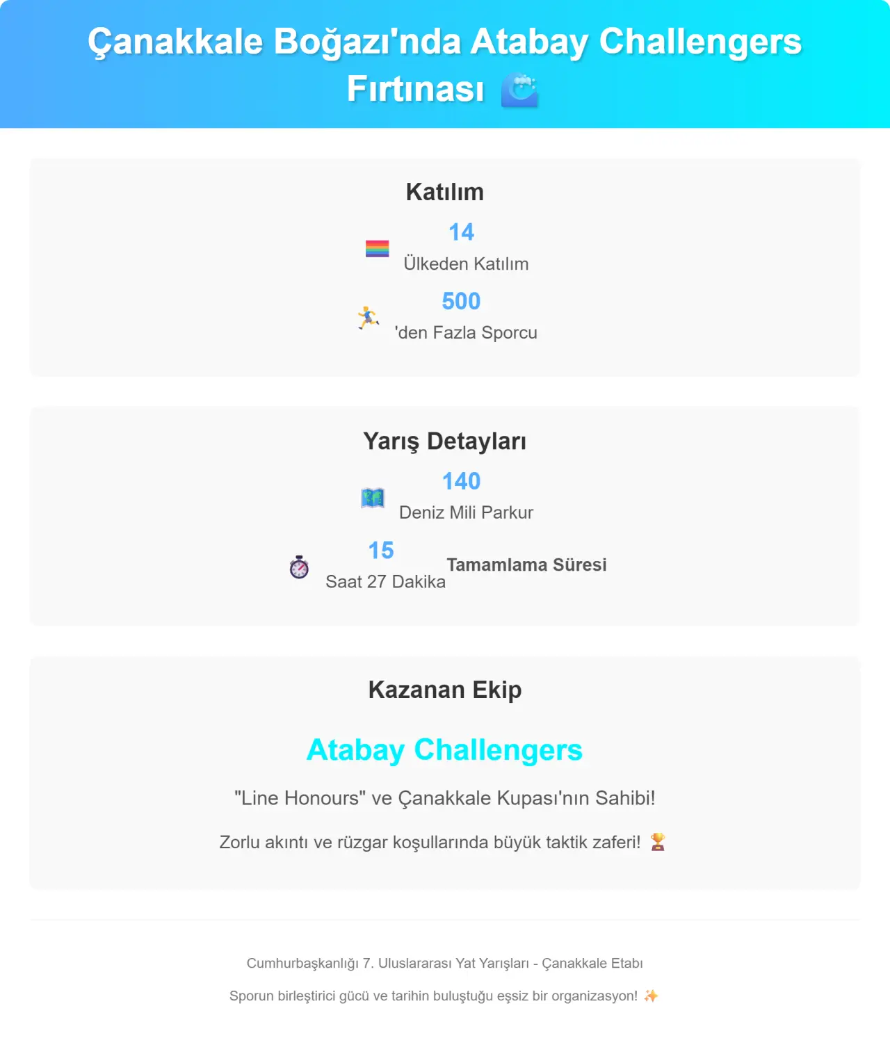 Cumhurbaşkanlığı 7. Uluslararası Yat Yarışları'nın heyecan dolu Çanakkale etabı, deniz üzerindeki nefes kesen mücadelelerin ardından sona erdi. İstanbul'dan start alan ve Çanakkale Boğazı'nın zorlu sularında noktalanan dev organizasyonda, tüm rakiplerini geride bırakmayı başaran Atabay Challengers ekibi zaferini ilan etti.
