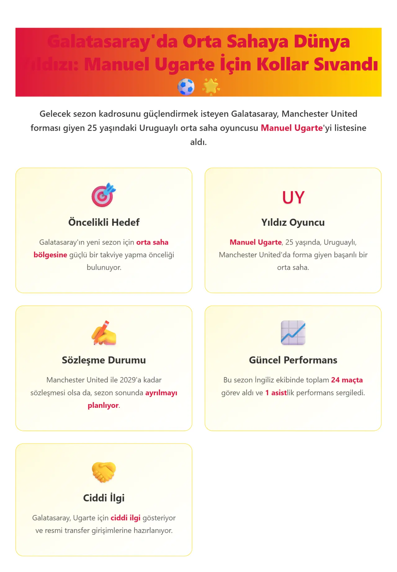 Yeni sezon için transfer çalışmalarına hız kesmeden başlayan Galatasaray, kadrosunda önemli bir revizyona gitmeye hazırlanıyor. Sarı kırmızılı yönetimin öncelikli hedefi, orta saha bölgesine yapılacak güçlü bir takviye ile takımı yeni döneme hazırlamak. Bu doğrultuda çalışmalarını sürdüren Galatasaray'ın gündemine gelen ilk ismin ise Uruguaylı yıldız Manuel Ugarte olduğu öğrenildi.