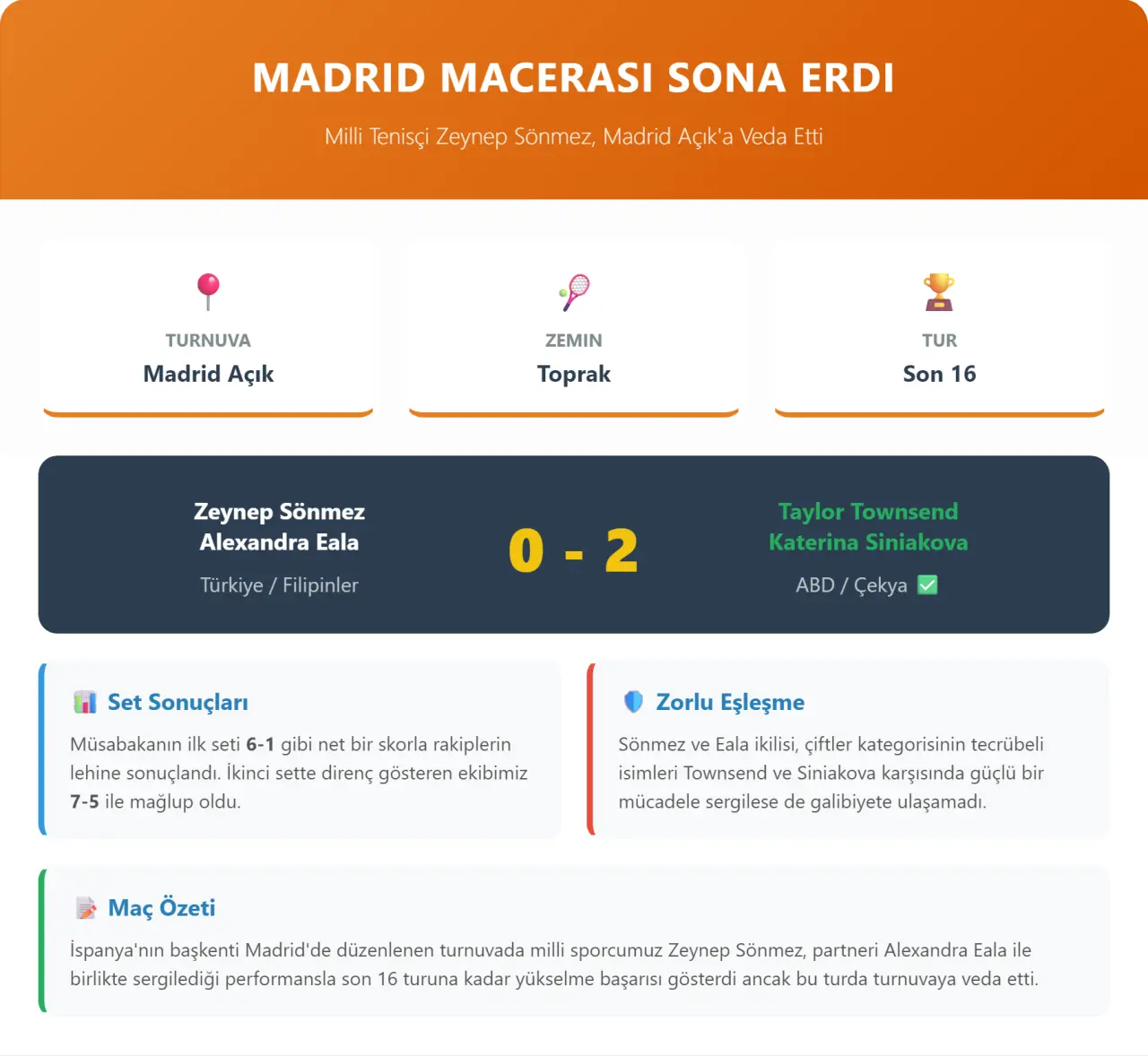 Büyük bir çekişmeye sahne olması beklenen maçta Taylor Townsend ve Katerina Siniakova çifti, ilk seti 6-1 gibi net bir skorla kazandı. İkinci sette daha dirençli bir oyun sergileyen Sönmez-Eala ikilisi, seti 7-5 kaybedince maçtan 2-0 mağlup ayrıldı. Bu sonuçla birlikte milli tenisçi Zeynep Sönmez, Madrid Açık'taki serüvenini son 16 turunda tamamlamış oldu.