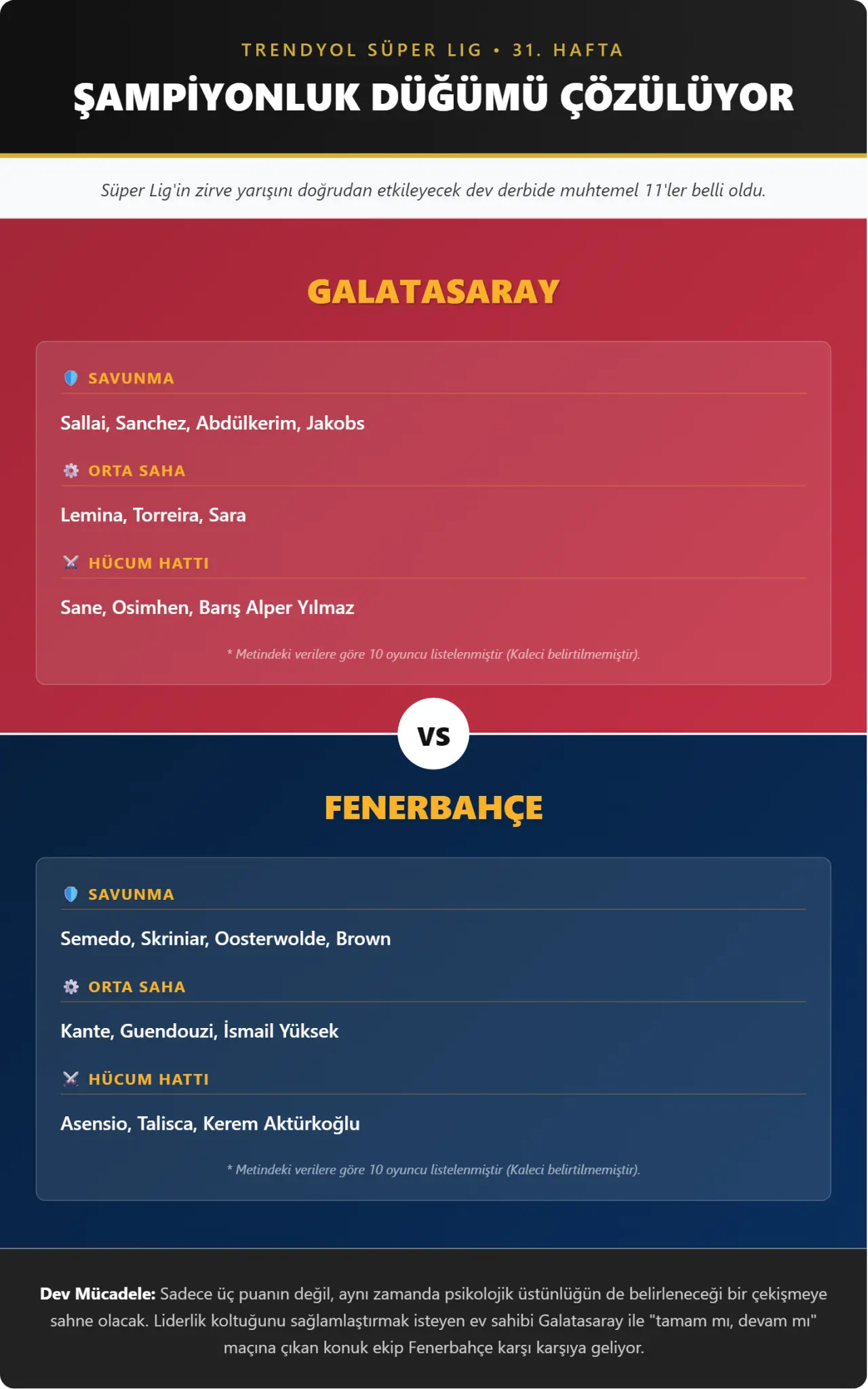 Trendyol Süper Lig'in 31. haftasındaki şampiyonluk derbisi öncesi heyecan dorukta. Galatasaray ve Fenerbahçe'nin sahaya çıkması beklenen muhtemel 11'leri belli oldu.