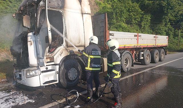 Tırı yol kenarına park ederek inen sürücü durumu itfaiye ekiplerine haber verdi.