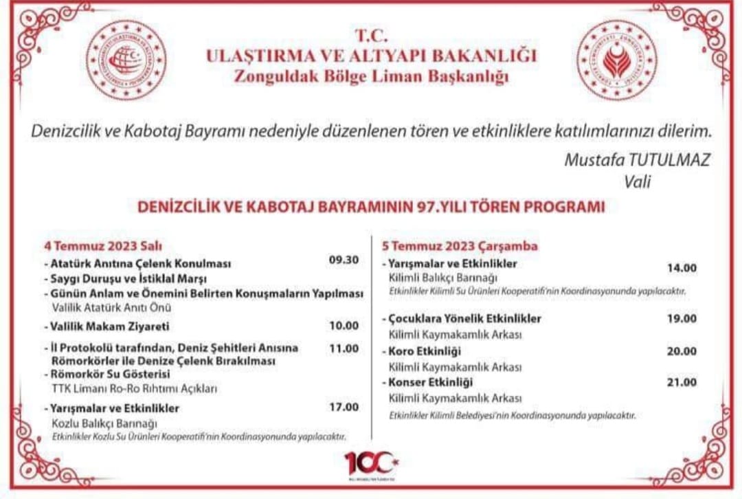 Zonguldak Valiliği 1 Temmuz Kabotaj ve Denizcilik Bayramı için 4 Temmuz Salı günü program düzenledi.